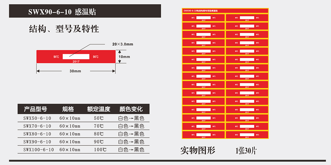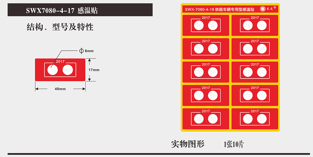 Special temperature label for passenger railway wire and cable (SWX series) is manufactured in accordance with the TJ/CL442-2015 "Temporary Technical Conditions of Special Thermometric Label for Passenger railway wire and cable" issued by China Railw...