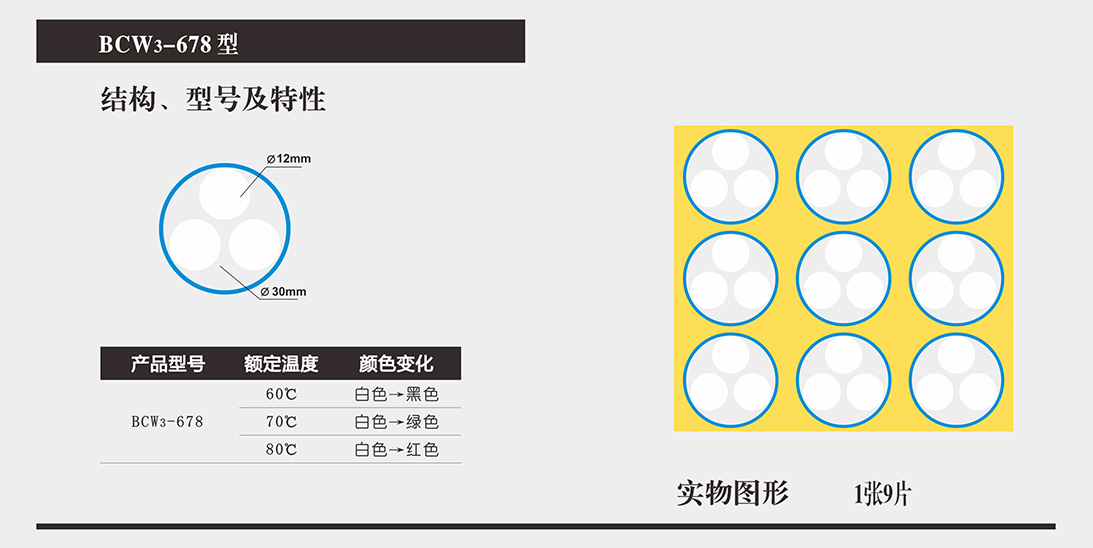 2.使用時如欲知道監溫部位溫度逐漸上升的情況,可粘貼兩片以上不同額定溫度的變色測溫貼片,亦可使用BCW-678型、BCW-789型(每片中含三種額定溫度)貼片。