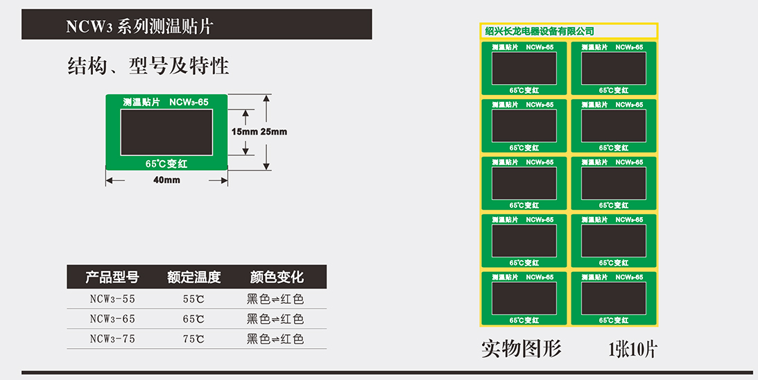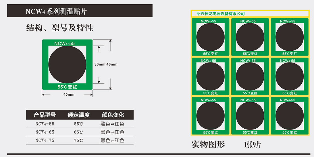 NCW系列測溫貼片,一旦監溫部位溫度達到或超過測溫貼片的額定溫度,變色測溫貼片立即由黑色變紅色,并在測溫貼片上顯示該處超溫的數字,冷卻下來后,測溫貼片又馬上恢復原來的顏色(黑色),即所變顏色可逆,貼片可繼續使用。